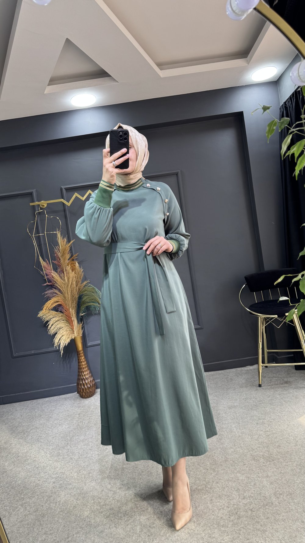 Omuzda metalik düğme detayları ile gözleri kamaştıran tasarım