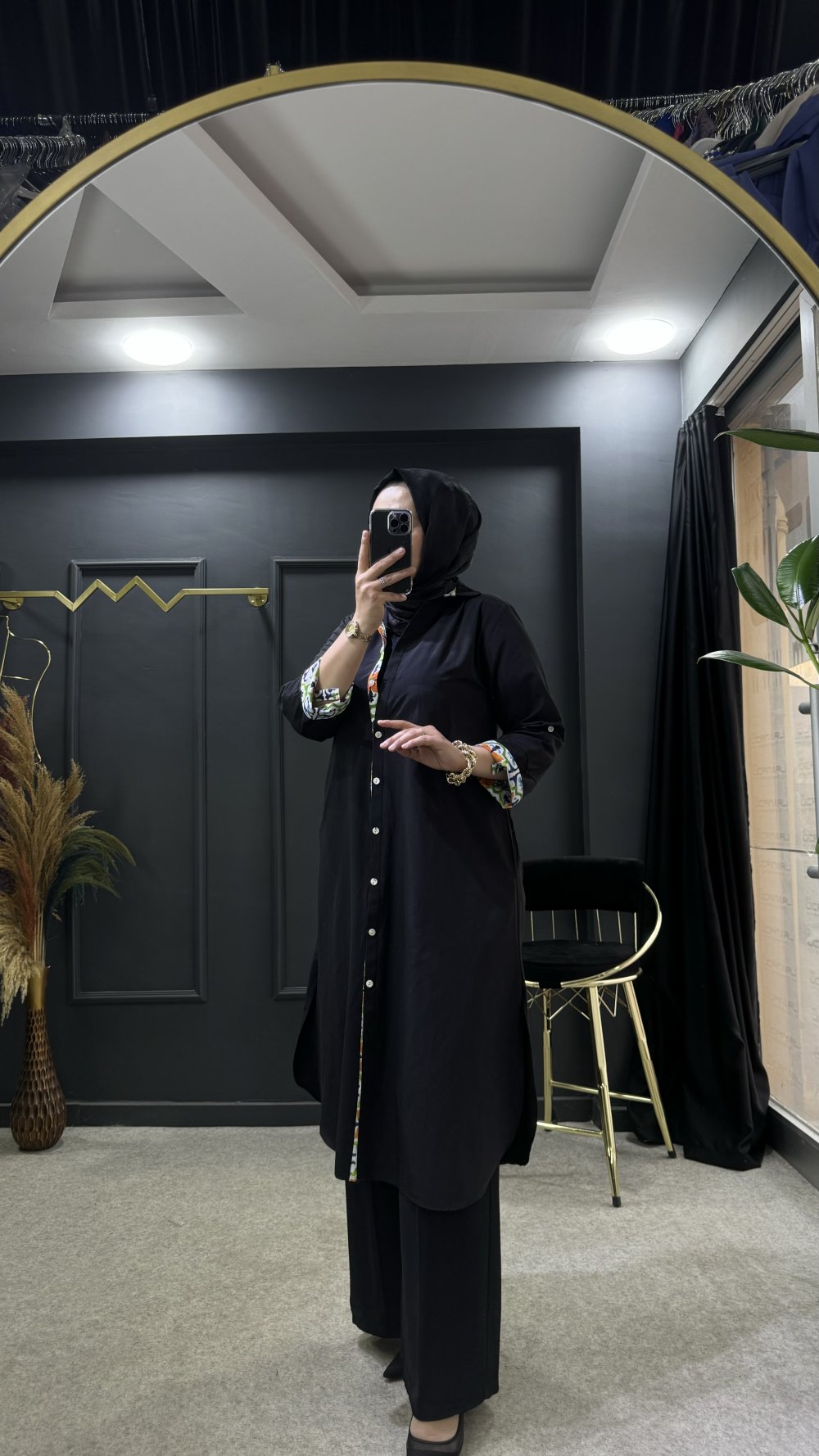 3. ⁠renk siyah  iç manşet be on biye yakalarda renkli desenli kumaş kullanılmıştır